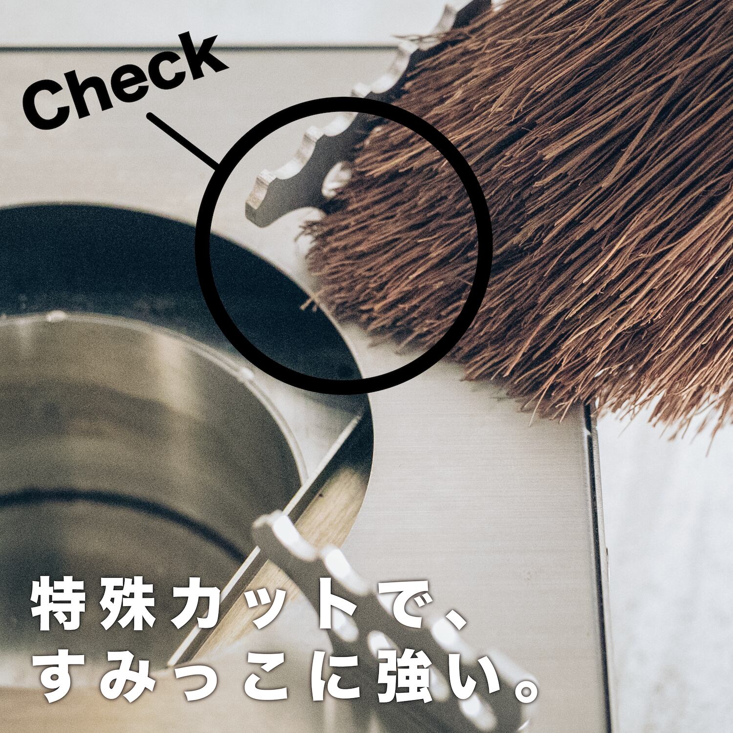 穂先に向かって細くカットしたデザインは、360°どこでも掃くことができ、見た目にも美しく、ほうきならではの「掃き癖」がつきにくくなっています。