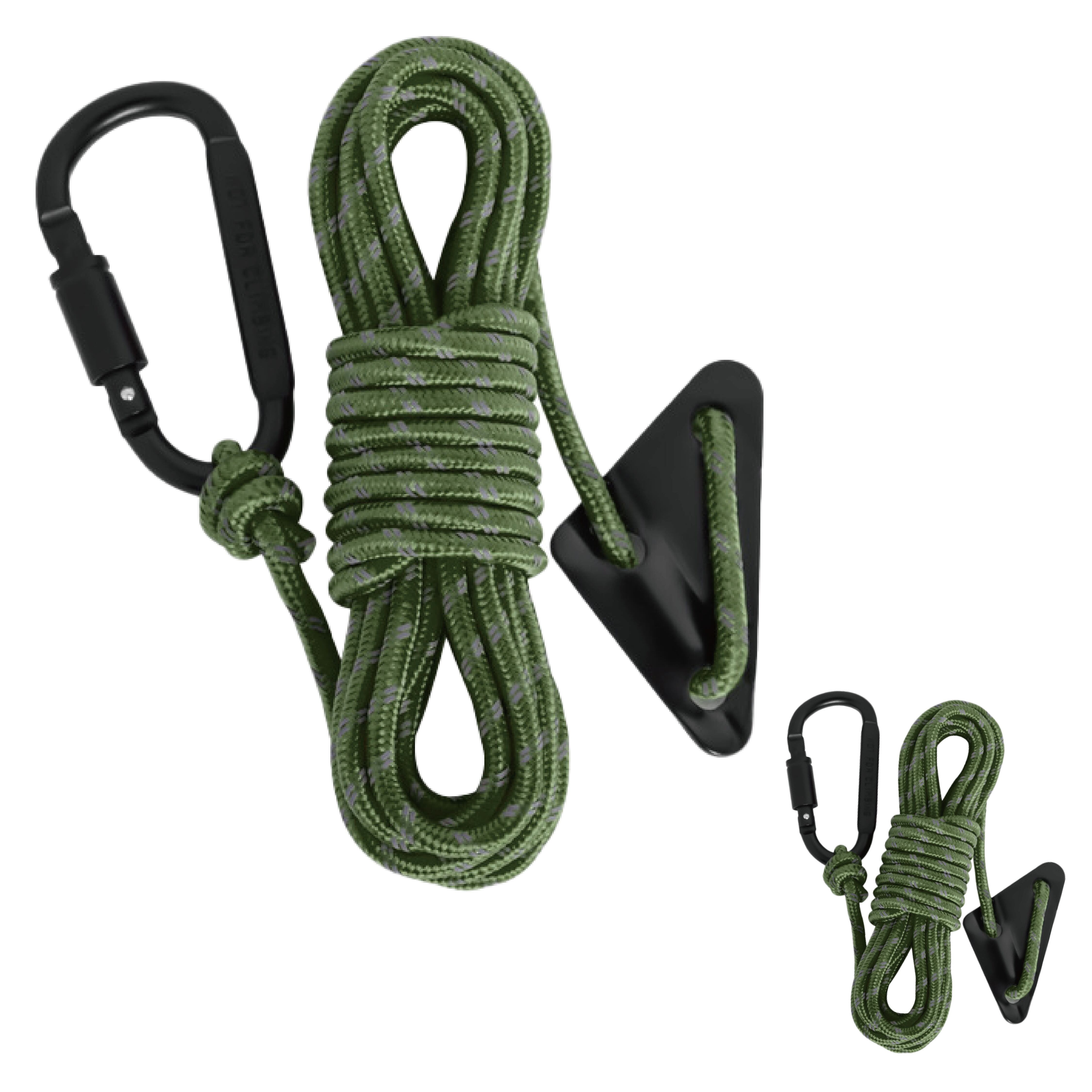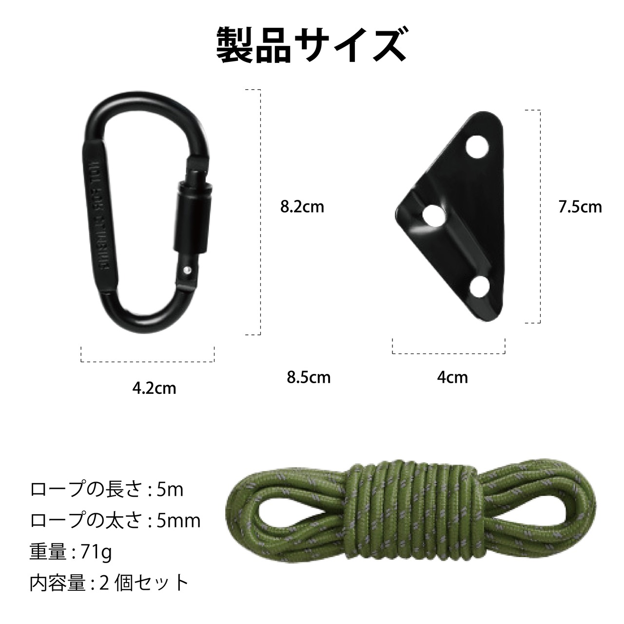 5mm * 5mのロープ2本、 アルミニウム製自在金具2個、カラビナ付き2個。