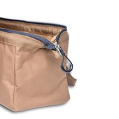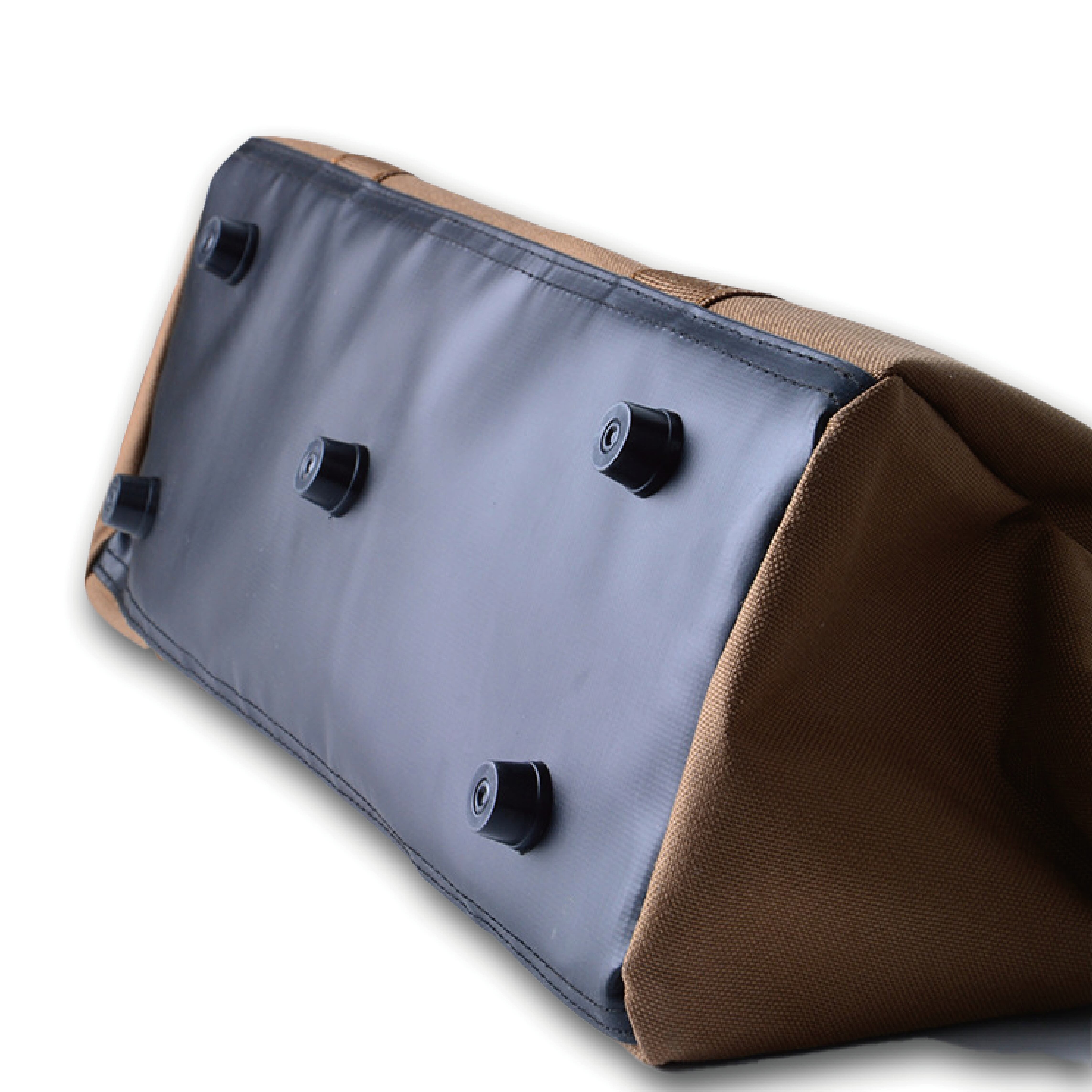 帆布やPU素材、YKKジッパーなど丈夫な素材を採用しています。 開口部に「がま口」のような金具があり、チャックを開けるとパカっと大きく開きます。 底面は厚手の合皮と樹脂製の足を配置し濡れた地面でもバッグ内部まで浸水しません。