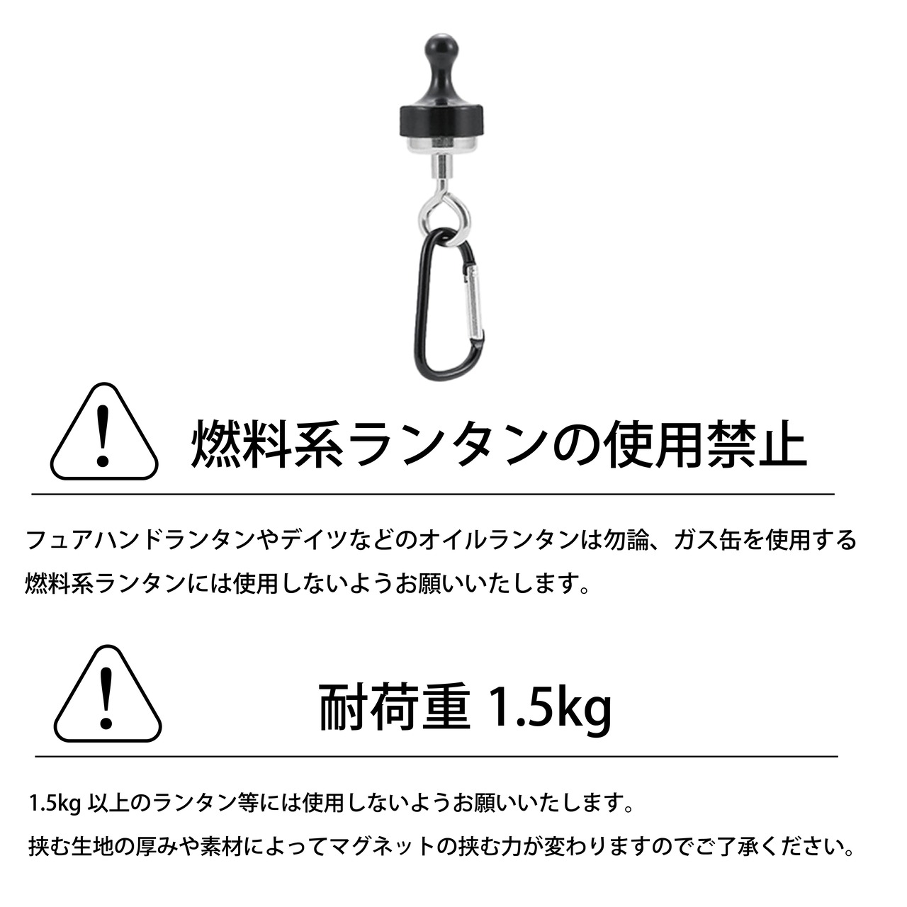 強力なマグネットを採用。最大1.5kgまでの小物を吊り下げるフックとしてキャンプ、アウトドアに適用します。