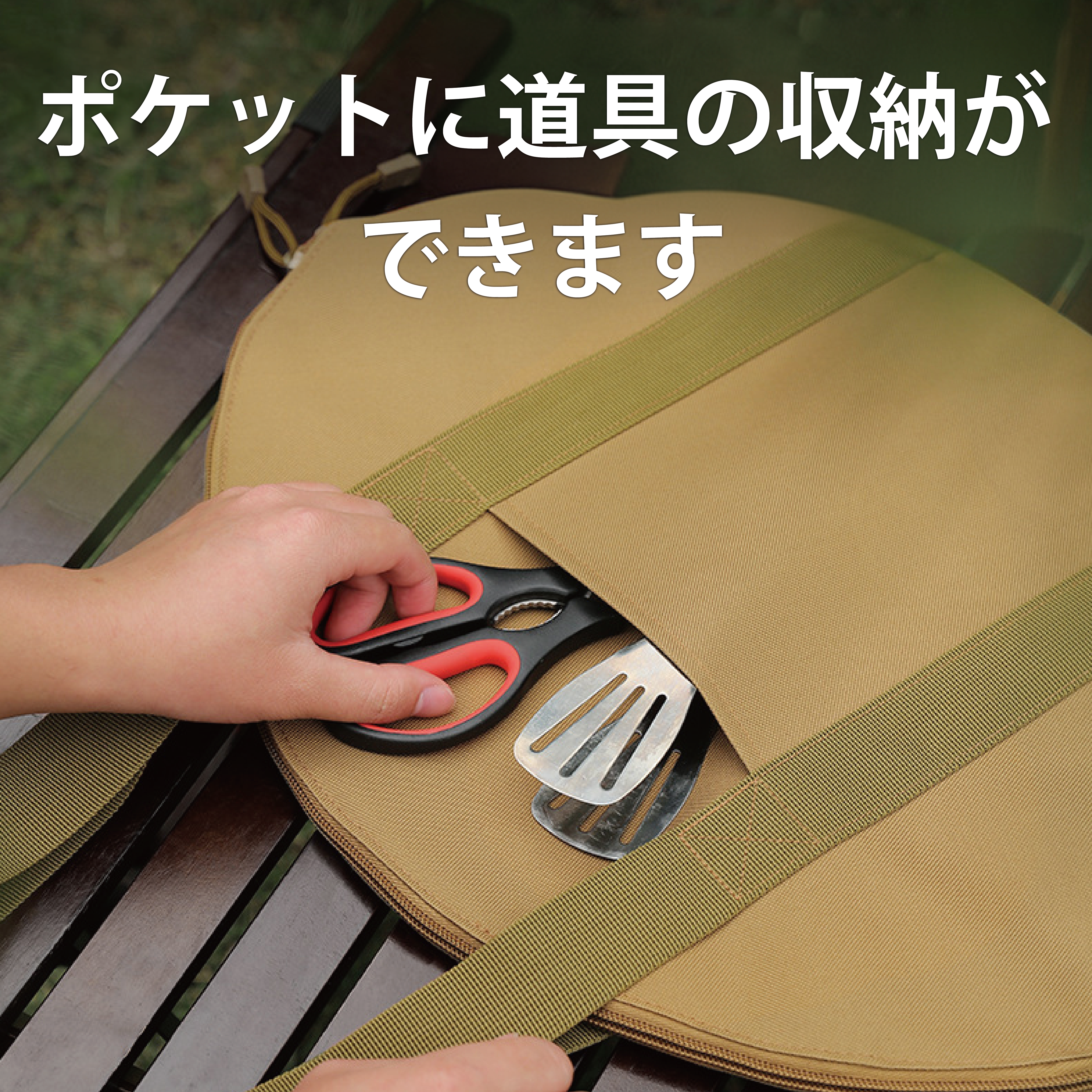 マルチグリドル収納ケースの側面には小物をすっきりと収納できるサイドポケットが設けられており、アクセサリーや小道具の整理に最適です。