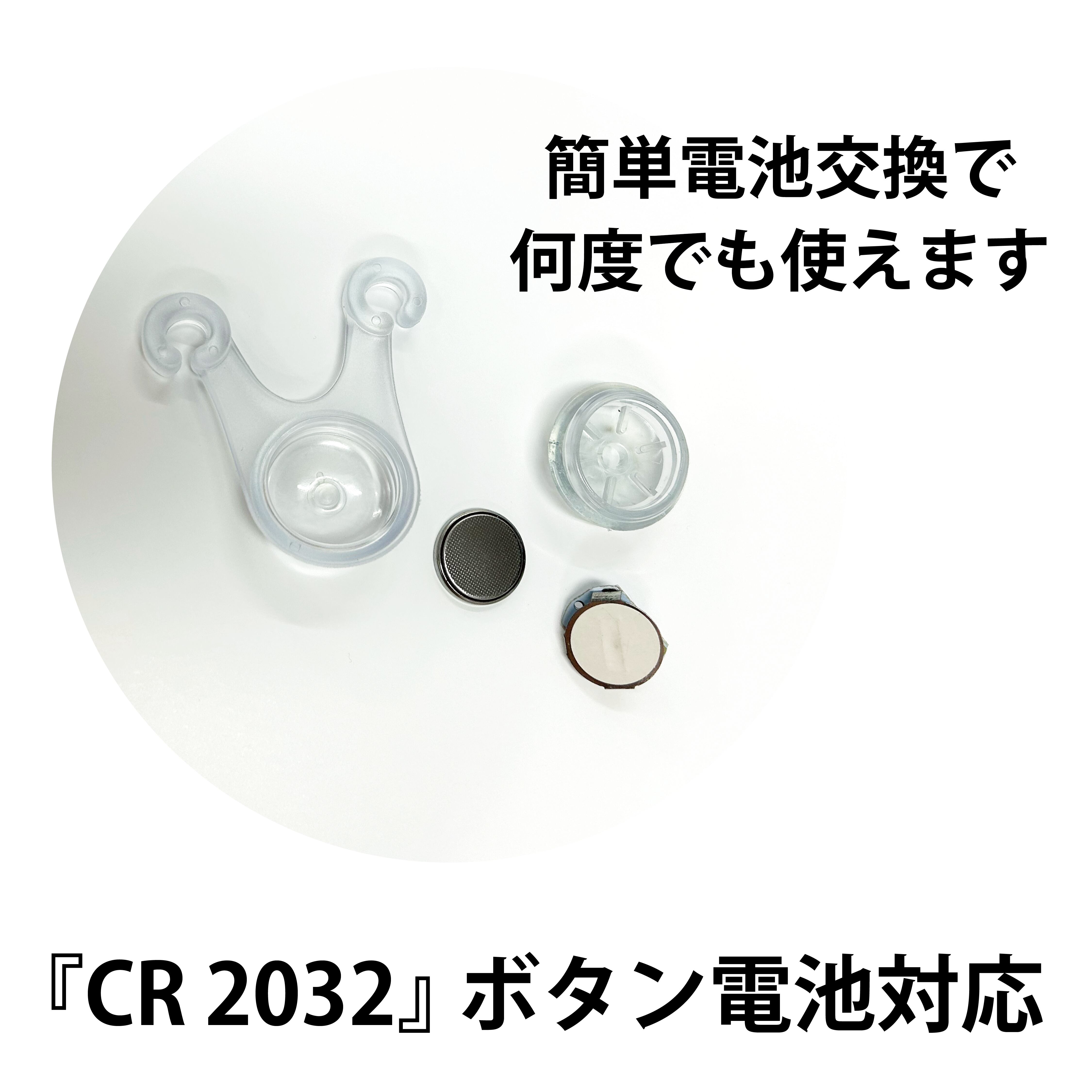 電池の交換が簡単な設計で、電池が切れてもすぐに予備電池と交換が可能です。 CR2032ボタン電池対応