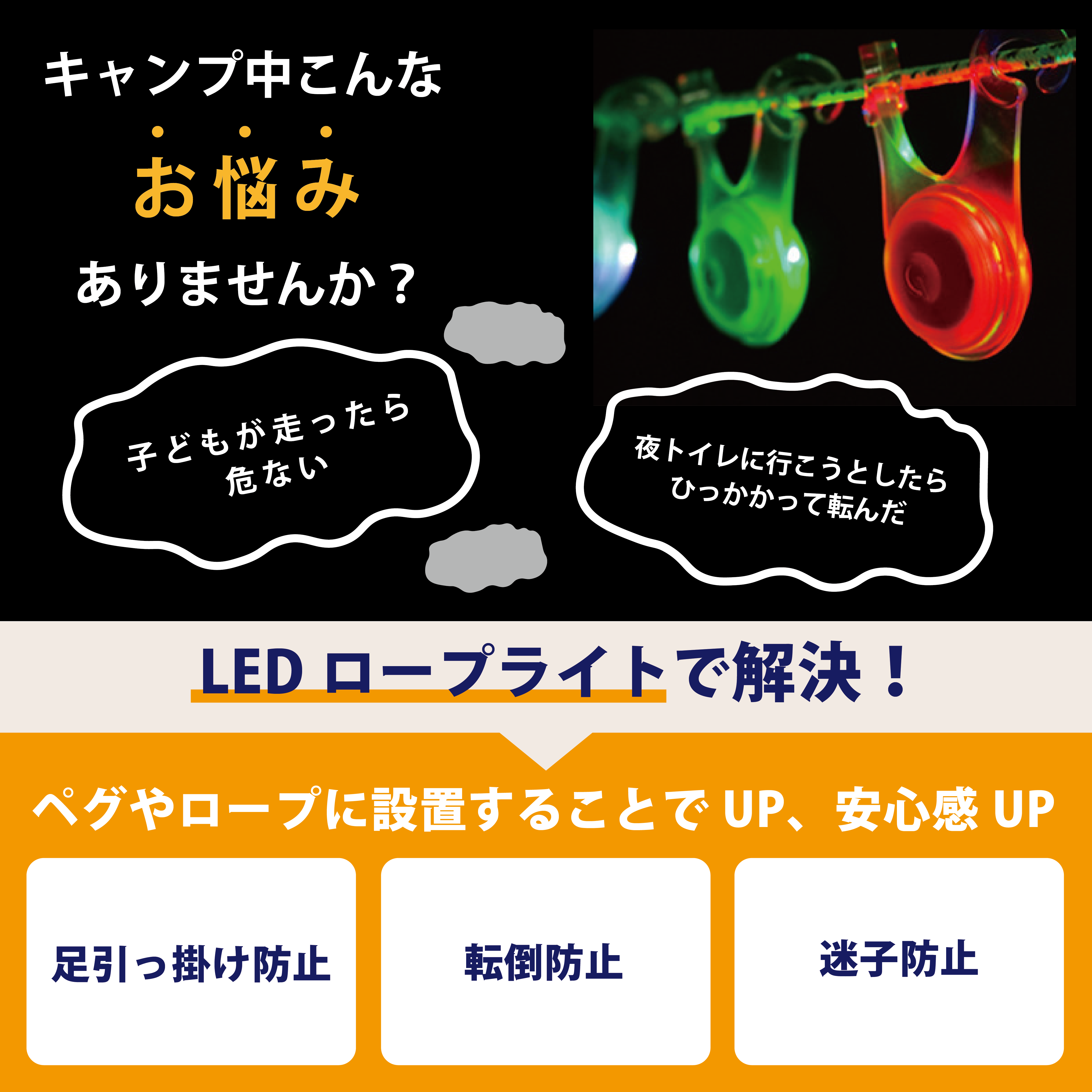 暗闇での使用を考慮し、転倒防止機能があり、ロープの位置がはっきりと識別できます。雨や夜露に強い防水設計で、悪天候にも負けない耐久性を備えており、安心して屋外で使用できます。