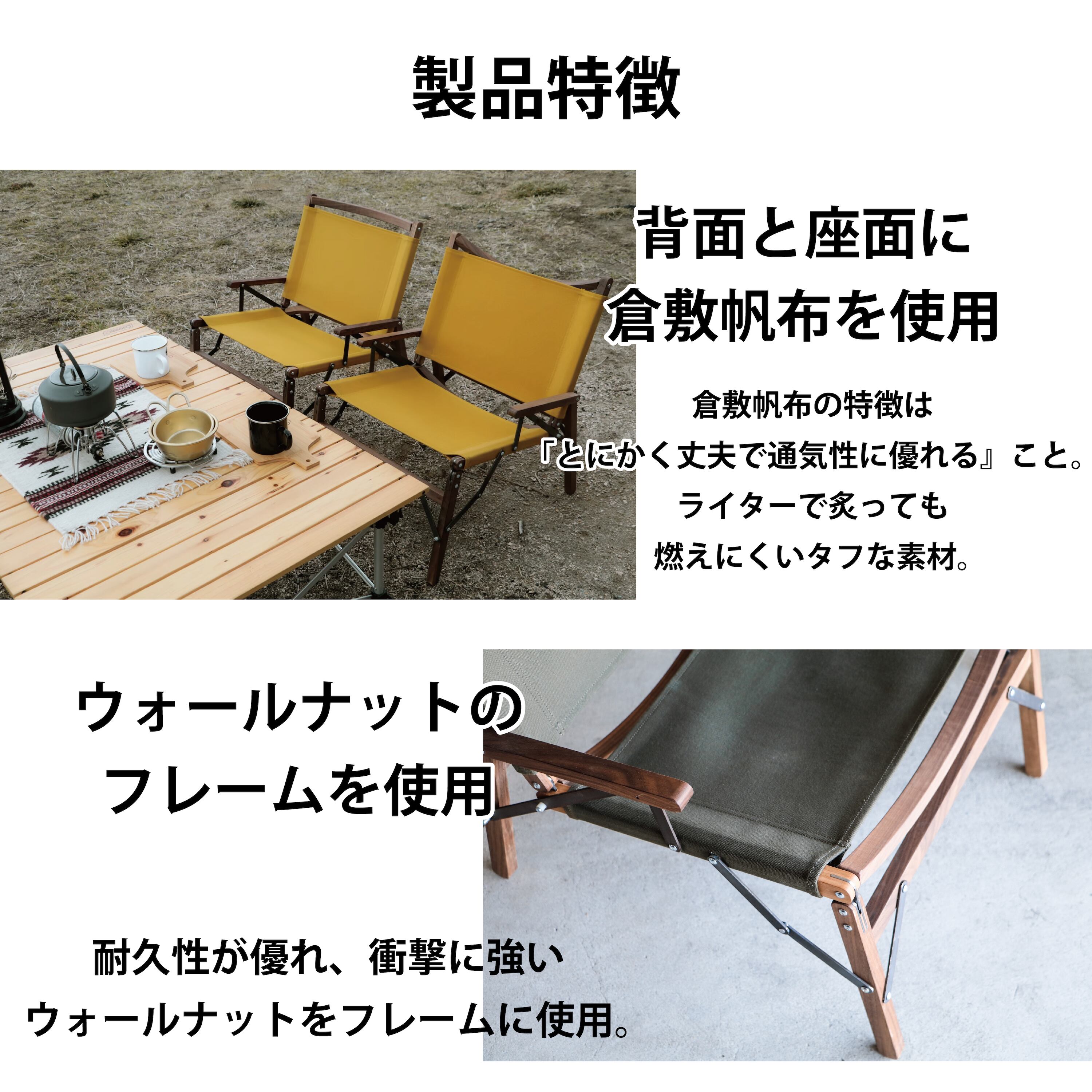 アウトドアチェアーでありながら、見た目の高級感と質感・座り心地の良さを追求した折り畳み式アウトドアチェアー。
