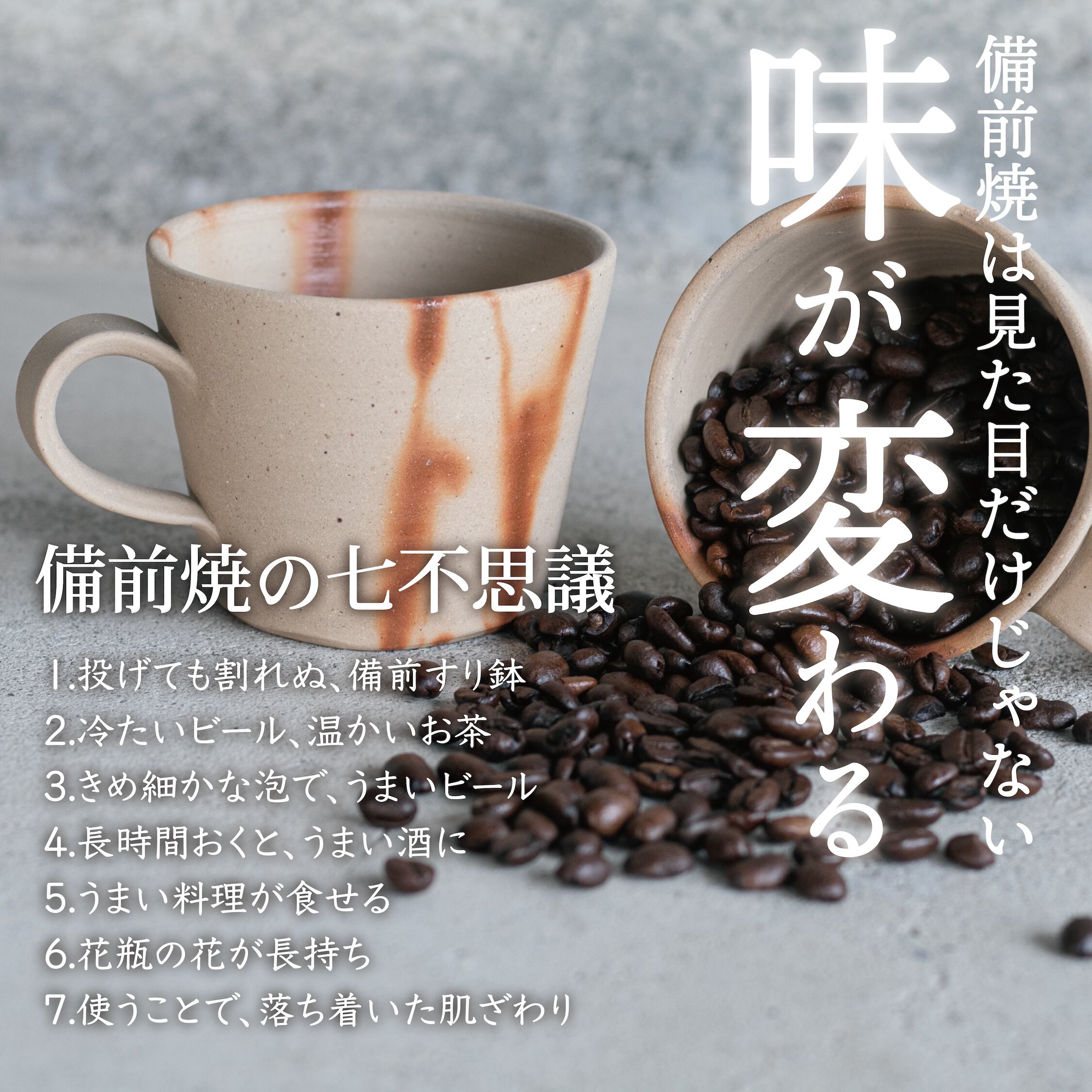 備前焼の表面の微細な凸凹が、より使い込むことにより角が段々と取れ、使えば使うほど落ち着いた味わいを増します。
